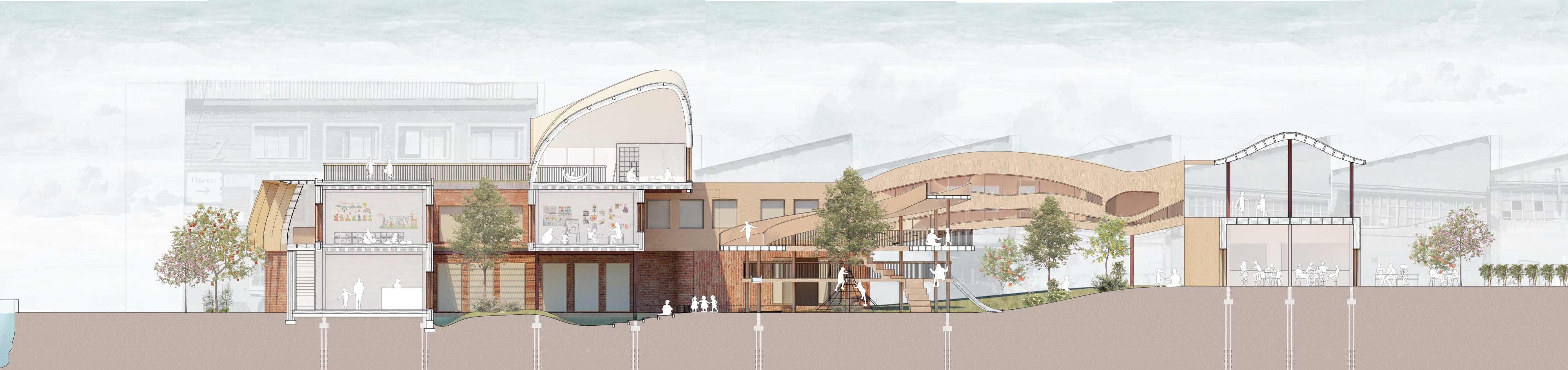 Spaces for collective to individual, and active to passive play increase the possibilities of play and freedom for the children. The marketplace lies behind the nursery with a public allotment garden.
