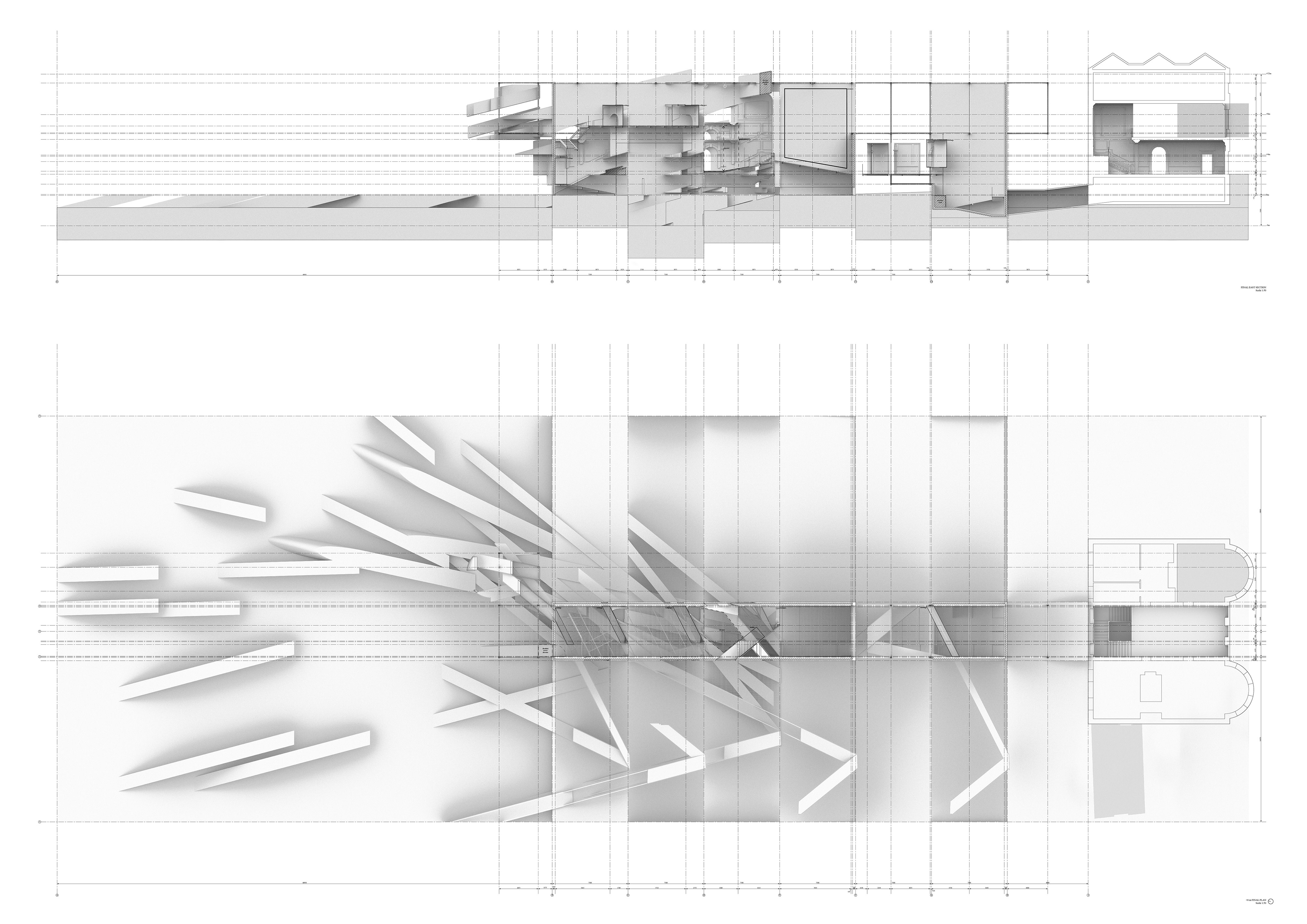 In the plan, it is visible how some projections are materialised as they intersect with the memory palace. While in the section, it is evident how where they intersect the surfaces of the existing house are replicated.