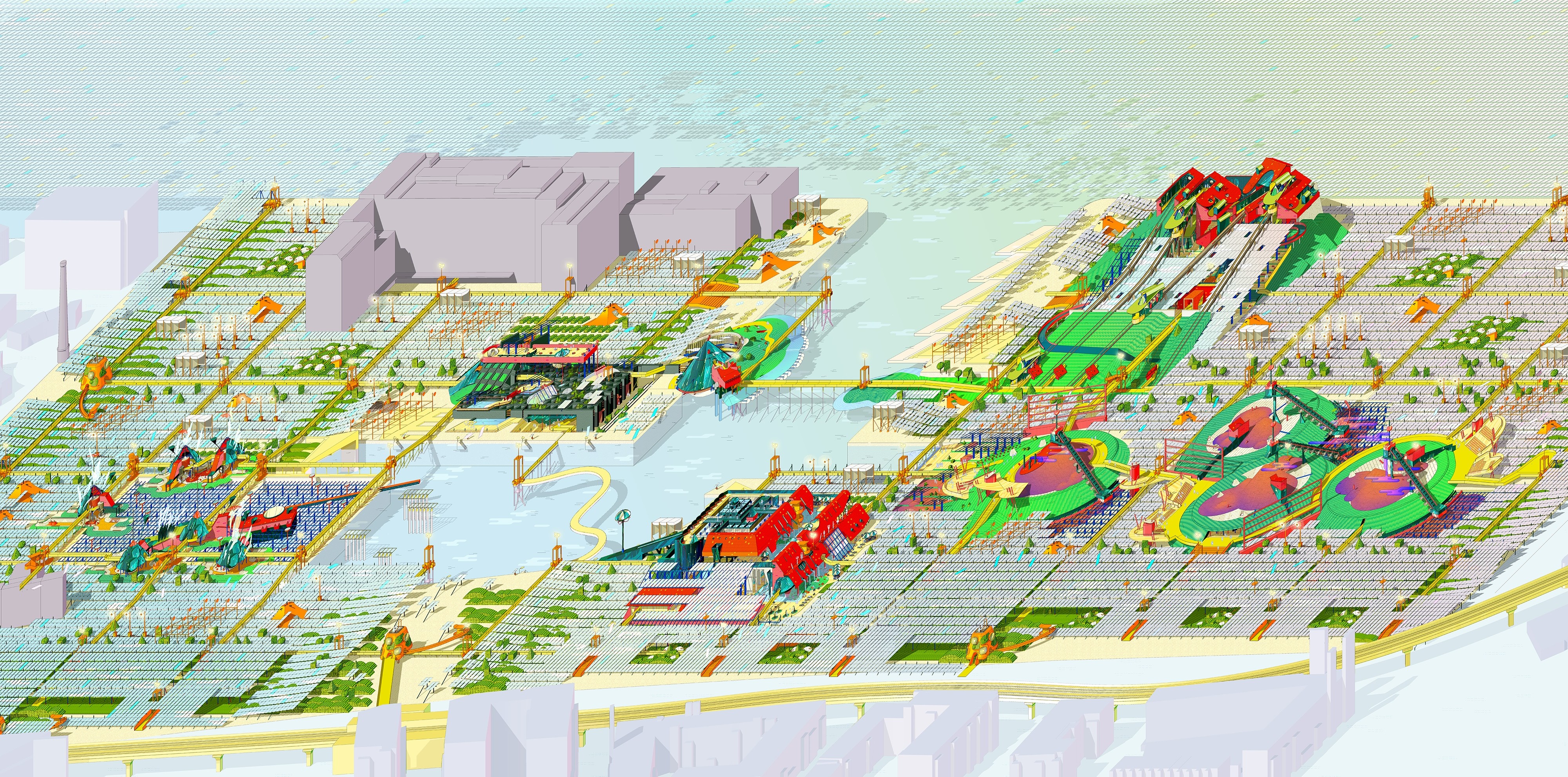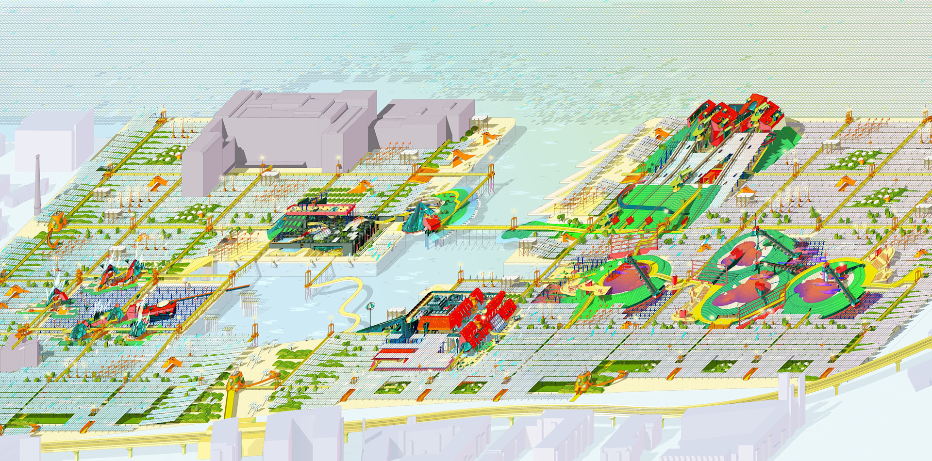 The dockland waterscape and the site are turned into a solar panel blanket that captures the energy, and the five battery landscapes store the energy for off-peak usage. The techno-parkscape demonstrates bold and trivial science imagination in a playful and immersive way. The working infrastructure celebrates the industrial history of this area and ushers Silvertown into the next technological era.