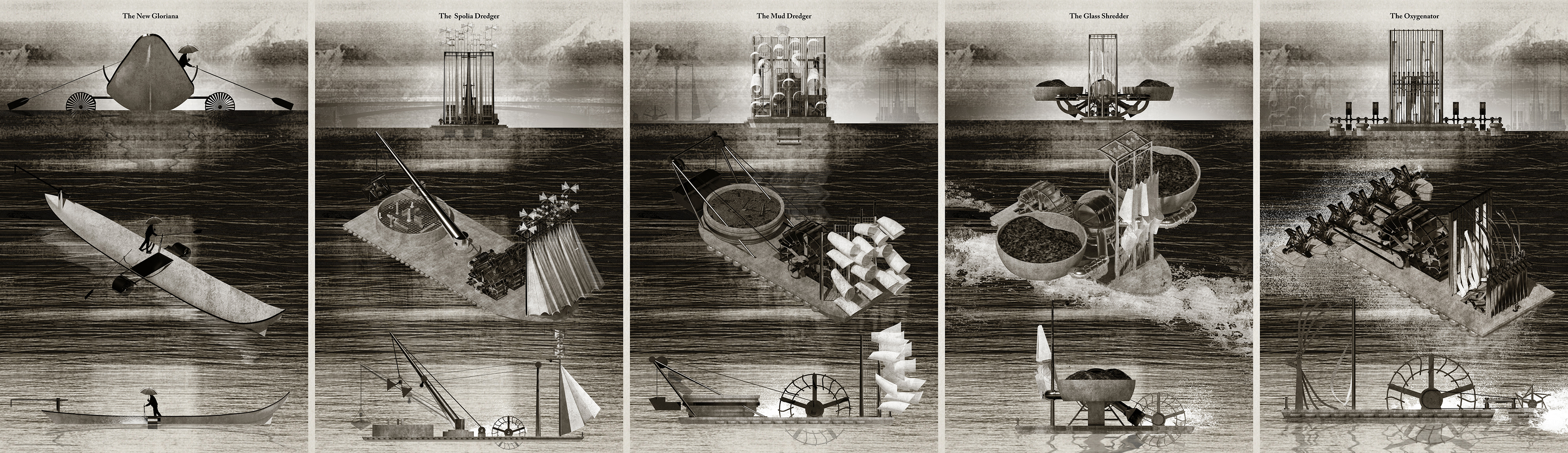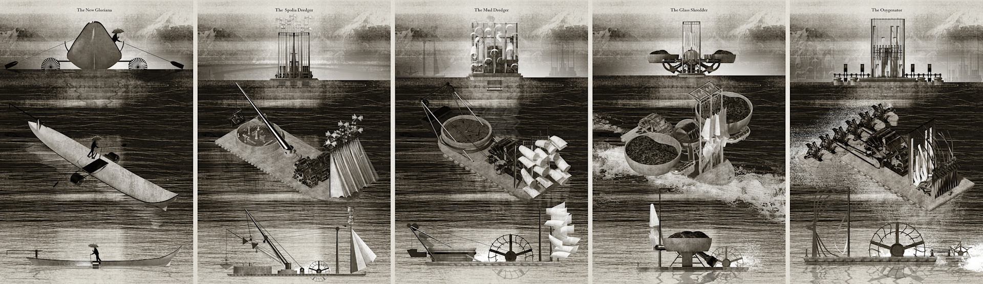 The dredging flotilla comprises four boats driven by the Thames' current that performs different dredging tasks. The flotilla is conducted by the Gloriana, the only human-steered boat.