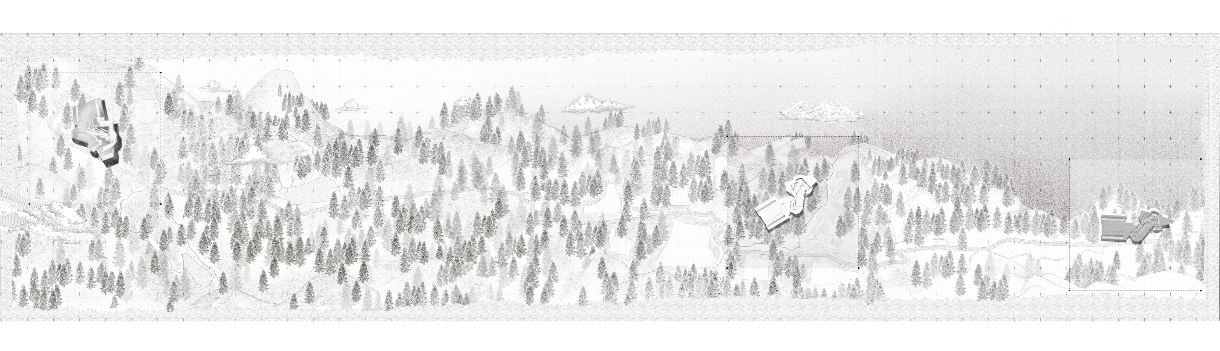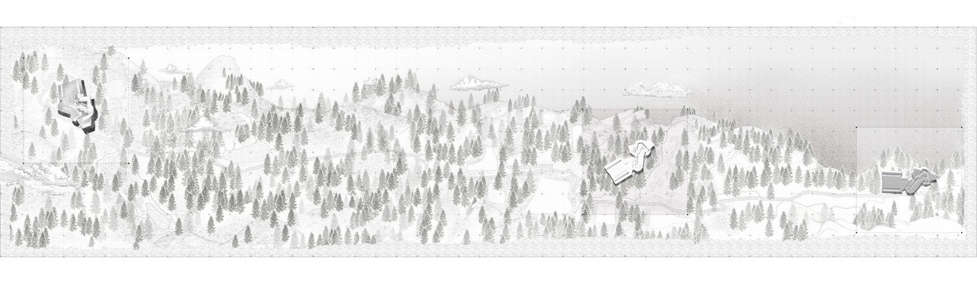 While the upper structure of the building is dismantled, the ground scape of the building remains permanently on the site as a memorial imprint of nomadic behaviours. This is based on the study of cow gaits and cow-handling systems, in addition to the coexistence of humans and cattle in a traditional Black Forest Farm.